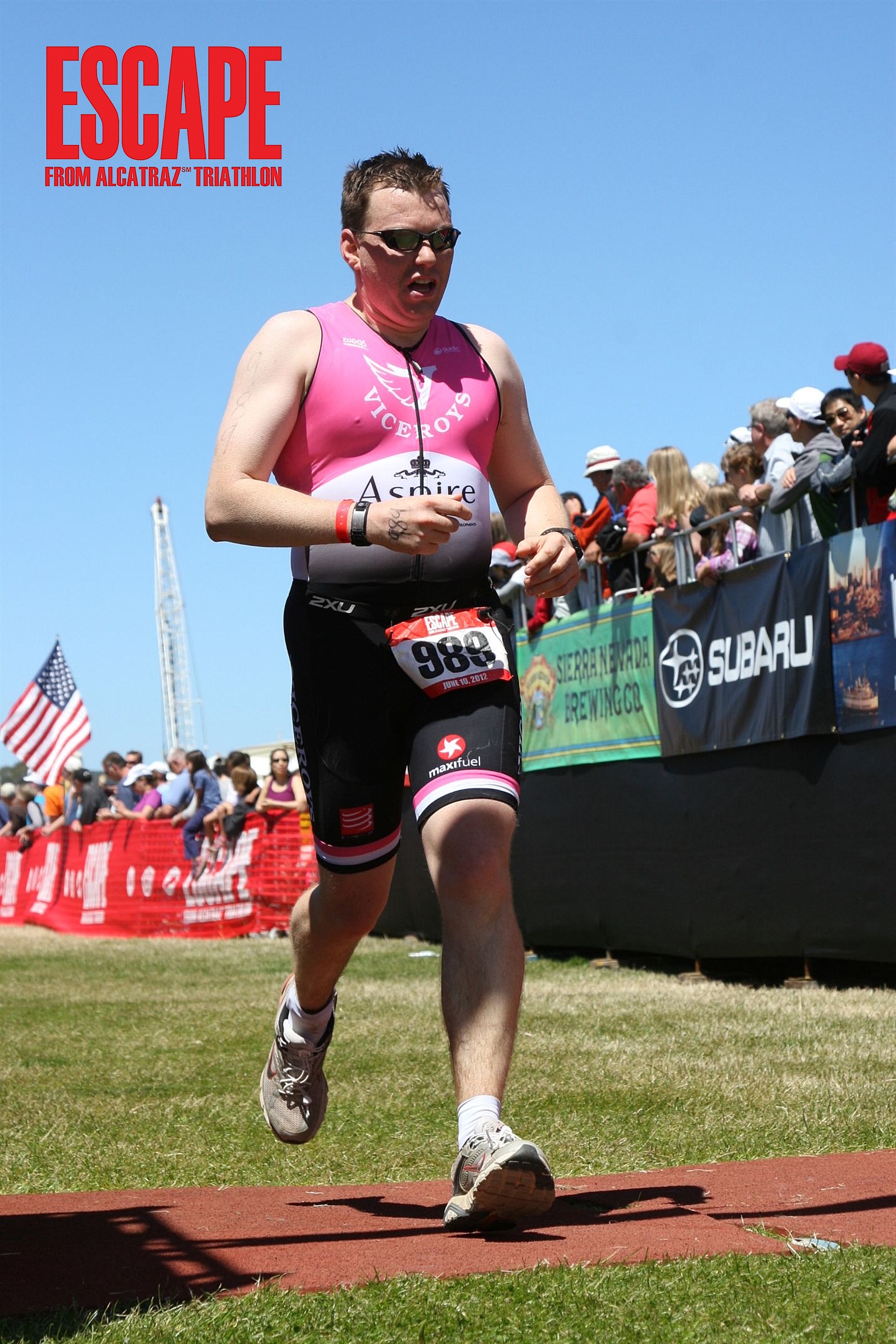 The run was amazing with well staffed aid stations at every mile with Americans doing what Americans do best who whooping, hollering and hi-5’s all round and I loved it, I took water or gatorade at most of the stops yet in spite of what felt like a near constant intake of liquid it was more than 4 hours post race before I needed to use the “bathroom”. Having passed under the Golden Gate Bridge I’d reached the highest point on the run leg, the path was narrow and with athletes coming the other way it was single file in parts, any feeling fatigue or negativity to what I was trying to do instantly evaporated as I passed a fellow escapee who was completing the race on cheetah blades, I certainly had nothing to complain about. The run down to Baker beach was a nice wide trail, followed by the run along the beach to the turnaround point. At this point on the way out you are supposed to run on the soft sand at the top of the beach, returning along the waterline, following those before me and running on the damp sand made life a lot easier, hitting the turnaround I knew the challenge of the sand ladder was ahead along with the climb up to the bridge before the downhill into the finish chute. Running along the waterline was nice, my pace felt fine and I knew I was on course to complete the race, although not having looked at my watch didn’t really know how long I’d been going.